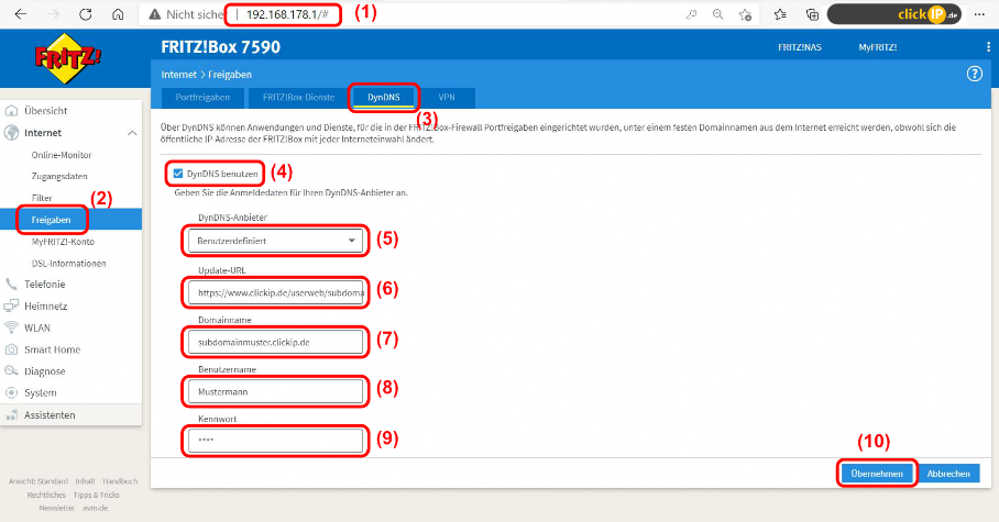 ( 7 ) Tragen Sie hier Ihre Sub-Domain ein z.B. ( xxxxxxx.clickip.de )
